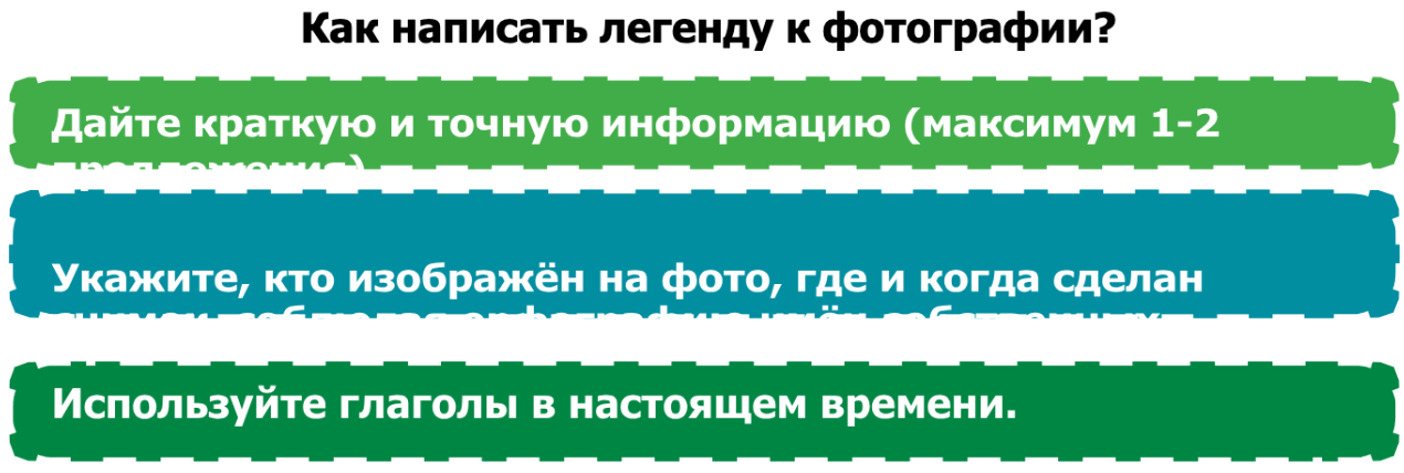 Пресс-фотографии обязательно должны быть опубликованы вместе с легендой. Легенда – это краткий пояснительный текст, сопровождающий фотографию в прессе и раскрывающий, кто и в какое время запечатлён на ней. Легенда содержит историю. Если легенда отсутствует, то фотография может быть неправильно понята или интерпретирована, что может повлечь за собой манипуляции.