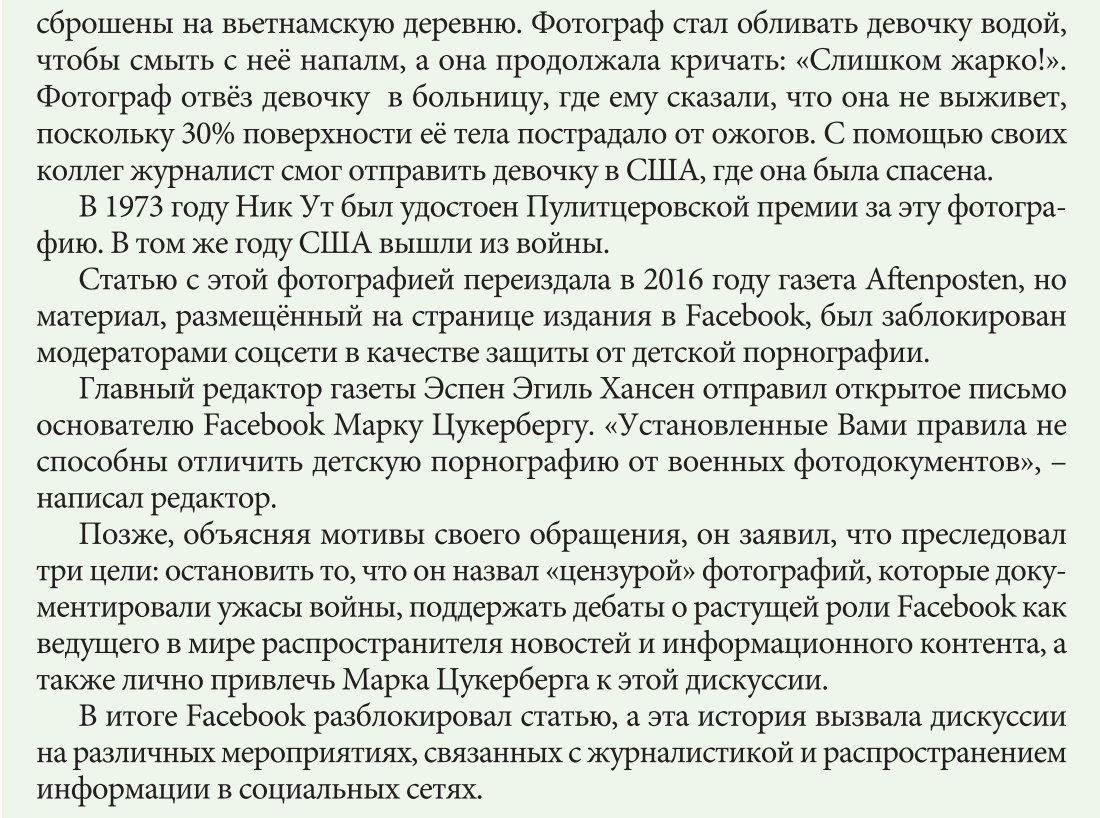 Крупнейшая газета Норвегии Aftenposten опубликовала известное фото, сделанное в 1972 году и получившее Пулитцеровскую премию – высшую награду в американской журналистике. Однако алгоритмы Facebook заблокировали фотографию, расценив изображение как детскую порнографию, вызвав возмущение главного редактора издания.