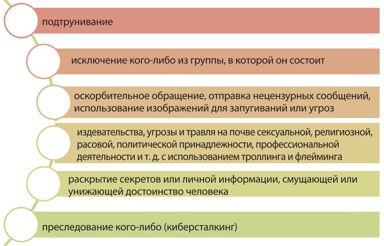 Кибербуллинг или преследование в Интернете является формой жестокого обращения, поэтому считается одним из проявлений насилия в сети. Такая агрессия может выражаться различными способами: