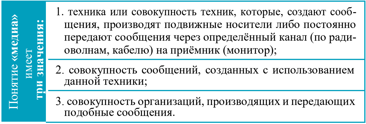 Средства массовой информации – это канал, по которому передаётся не только актуальная информация, но и социальные ценности, нормы, модели и формы поведения. Вместе с тем массмедиа являются формой развлечения и отдыха или просто способом проведения досуга. В результате, СМИ становятся частью нашей жизни и способны оказывать влияние на наше поведение, отношение и решения относительно действий, которые мы должны предпринять в профессиональном и/или личном плане. Понятие “медиа” имеет три значения: