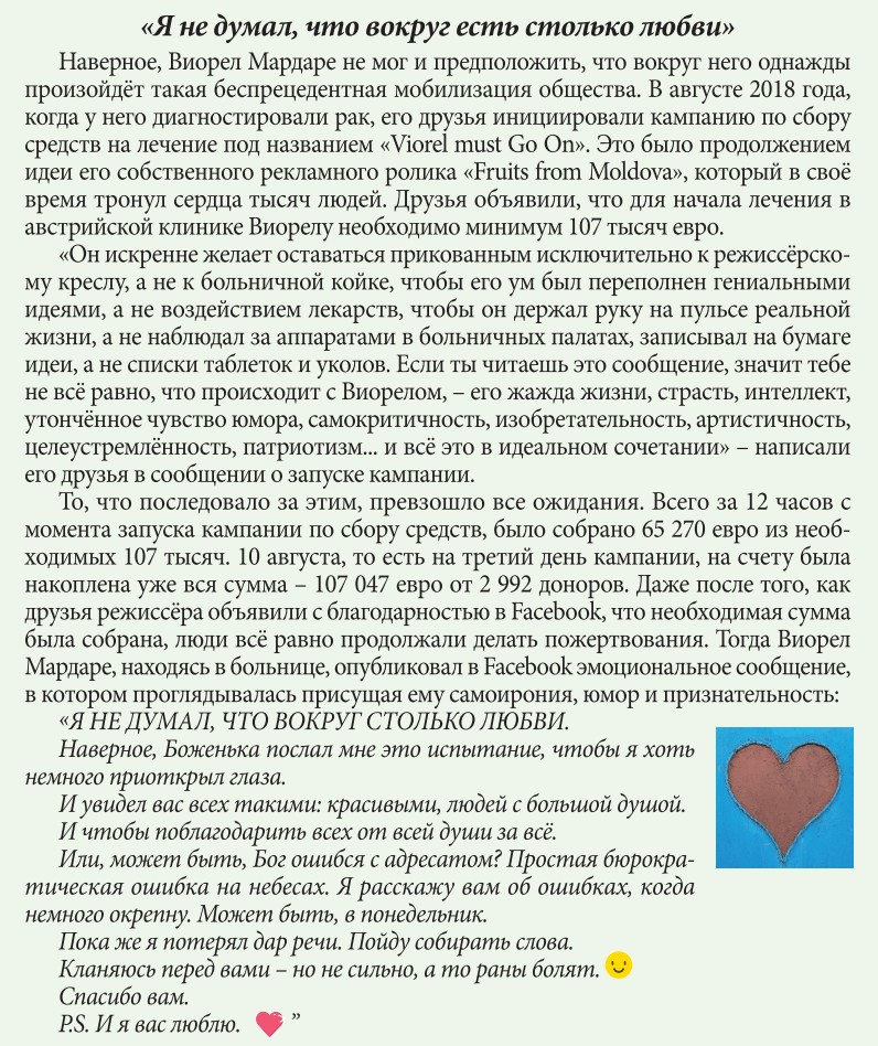 Сообщения, транслируемые через СМИ, могут быть разными по содержанию, формату, целям. Медиа всегда использовались как инструмент объединения сообществ вокруг какой-либо идеи. Работы покойного режиссёра Виорела Мардаре являются одними из самых популярных в Молдове, отличающиеся своей оригинальностью и способностью тронуть аудиторию.
