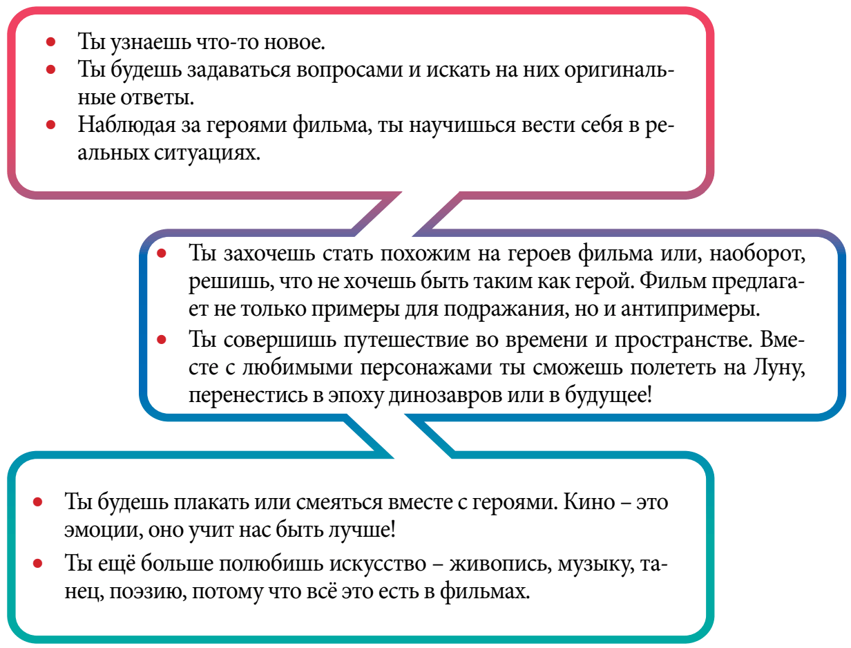 Каждый художественный, документальный или анимационный фильм содержит в себе определённое послание для того, кто его смотрит. Фильмы могут снимать на самые различные темы: семья, школа, спорт, история, путешествия, подводный мир, мир животных, научные открытия и т. д. В каждом возрасте есть свои предпочтения в той «магии», которую создают режиссёры, постановщики, художники, композиторы, актёры и другие члены команды по производству кино.