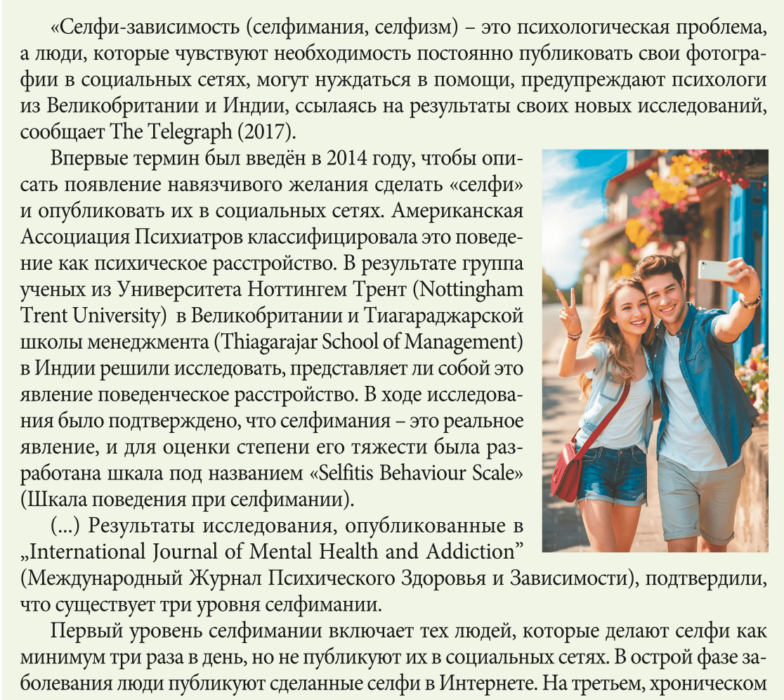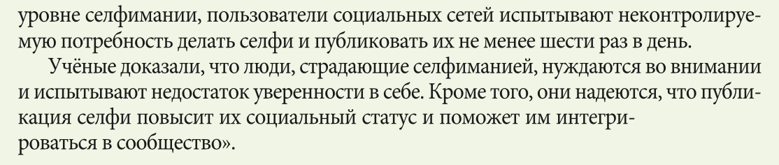 Селфи – это цифровой автопортрет. В определённом смысле, селфи – это развлечение, позволяющее запечатлеть подлинные моменты в разгар действия и с участием всех присутствующих. Для многих селфи стало настоящей страстью. Однако чрезмерное размещение селфи в социальных сетях может говорить о нарциссизме и снобизме. Некоторые, особенно молодые люди, часто подвергают свою жизнь реальной опасности ради сенсационного селфи. Известно много случаев, когда селфи стоило людям жизни.