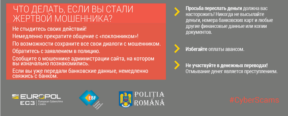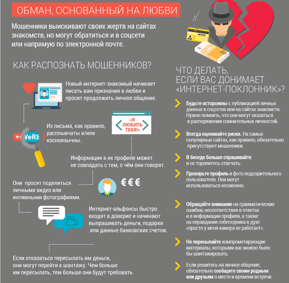 В заключение, рассмотрите и запомните важную информацию инфографика, касающуюся не только признаков сомнительных незнакомцев, которые пытаются вызвать у нас чувство ложной симпатии и любви в ходе онлайн-переписки, но и действий, которые следует предпринять для своей защиты или разоблачения «сентиментальных мошенников».