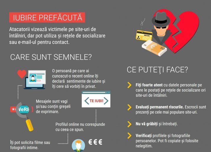 Concluzionând, reține informația rezumată în infograficul de mai jos privind atât semnele care induc online sentimentul de admirație, de dragoste, cât și acțiunile care este bine să le întreprindem pentru a ne proteja sau pentru a-i demasca pe escrocii sentimentali.