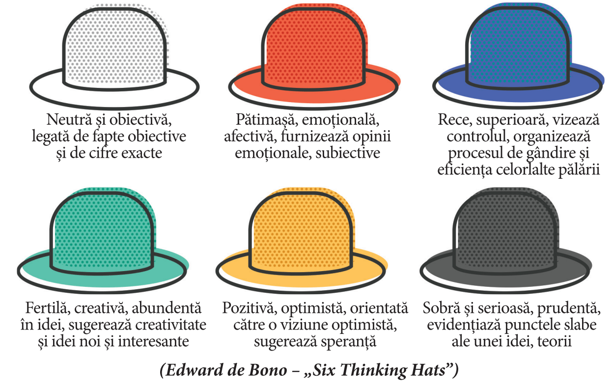 2. Lucrând în grupuri a câte 6 persoane, discutați despre fragmentul de text. Fiecare elev/elevă va juca un rol în funcție de culoarea pălăriei gânditoare pe care o poartă.
