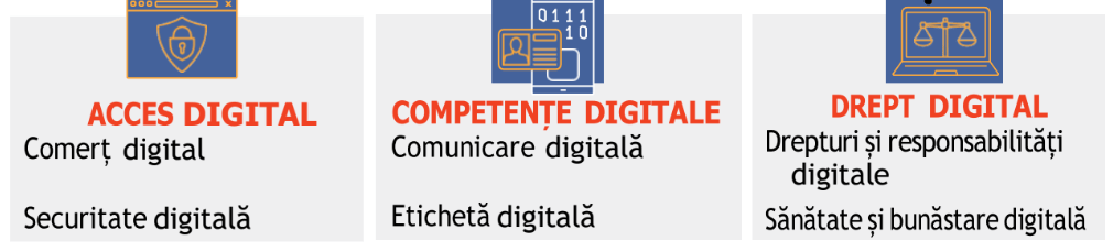 Specialiștii definesc nouă elemente esențiale ale cetățeniei digitale, pe care tinerii și tinerele ar trebui să le deprindă încă din școală. Printre acestea se numără: accesul digital, comerțul digital, securitatea digitală, comunicarea digitală, dreptul sau sănătatea și bunăstarea digitală. Comerțul digital, de exemplu, presupune că cetățeanul/cetățeana știe să facă cumpărături online, să rezerve bilete sau să achite facturi fără a merge la bancă. Sănătatea și bunăstarea digitală presupun utilizarea oportunităților oferite de tehnologii în medicină, dar și adoptarea unui comportament responsabil al utilizatorului care este conștient de impactul tehnologiilor asupra sănătății și are, prin urmare, un consum mediatic echilibrat și responsabil.