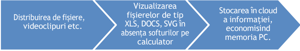 Alte oportunități utile, inclusiv cadrelor didactice, sunt oferite de Google Docs, cu care este ușor să se creeze formulare, chestionare, să se lucreze în comun la o prezentare, cu personalizarea paginilor prezentării și alegerea designului dorit. Pentru prezentarea documentului creat online, celor interesați se dă clic pe butonul Lansare prezentare și se invită participanții/participantele, introducând adresele lor de e-mail.