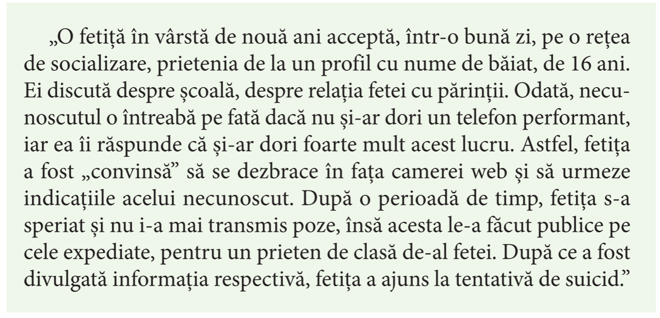 - ar putea convinge victima să-și atingă părțile {intime} ale corpului și să înregistreze imagini cu caracter sexual sau să ia parte la activități sexuale pe care să le difuzeze cu ajutorul unei camere web sau telefon inteligent (smartphone);
