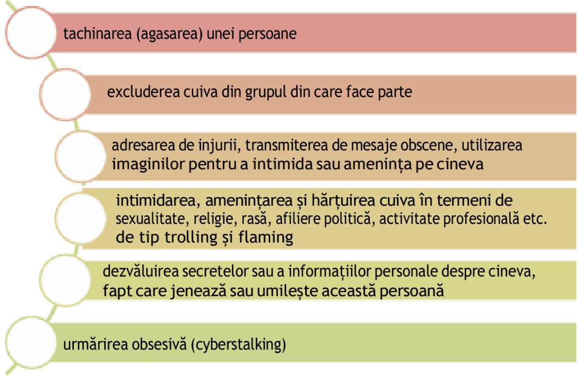 Teoretic, hărțuirea online este termenul folosit astăzi pentru a defini abuzul psihologic pe internet, care se poate manifesta prin: