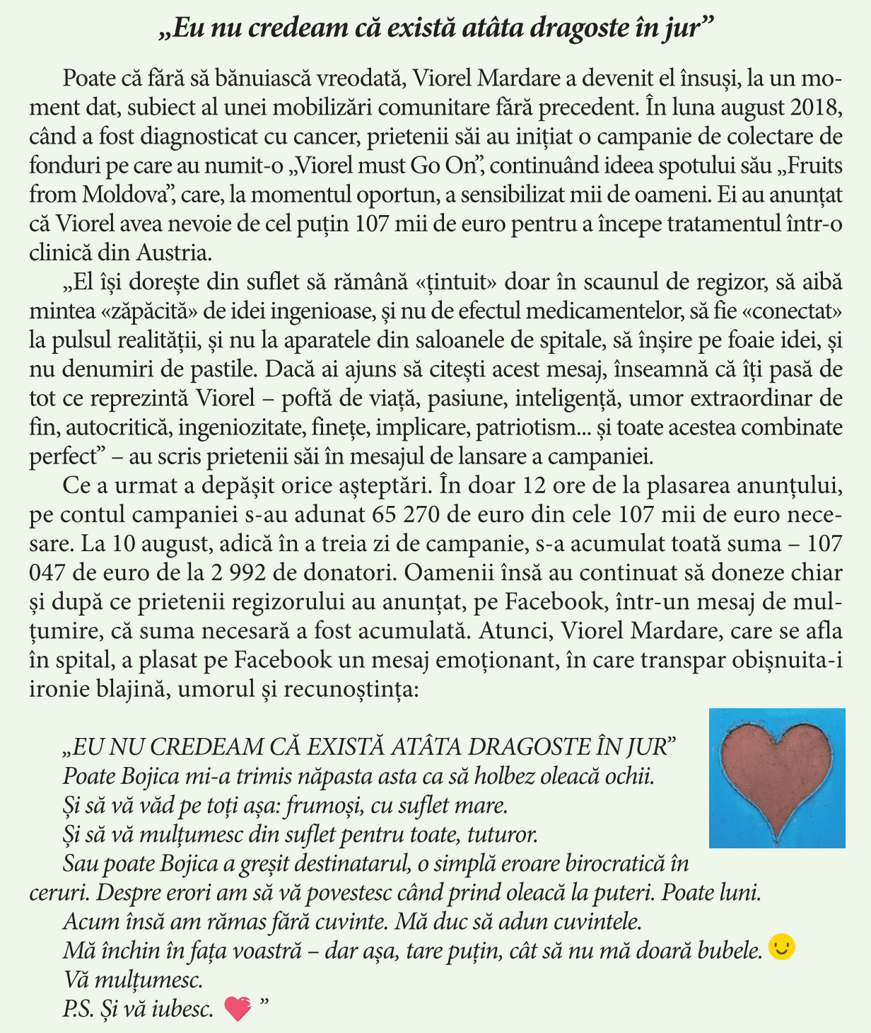„Dragi prieteni! Șapte luni am luptat împreună, am sperat. Această pagină de colectare de fonduri a fost șansa noastră, a tuturor, și mai ales a lui Viorel, de a depăși o etapă mai grea a vieții. El ne-a unit aici și ne-a arătat că totuși există nu multă, dar extraordinar de multă dragoste în jur”.